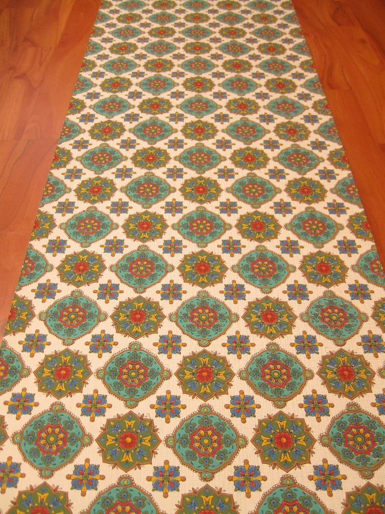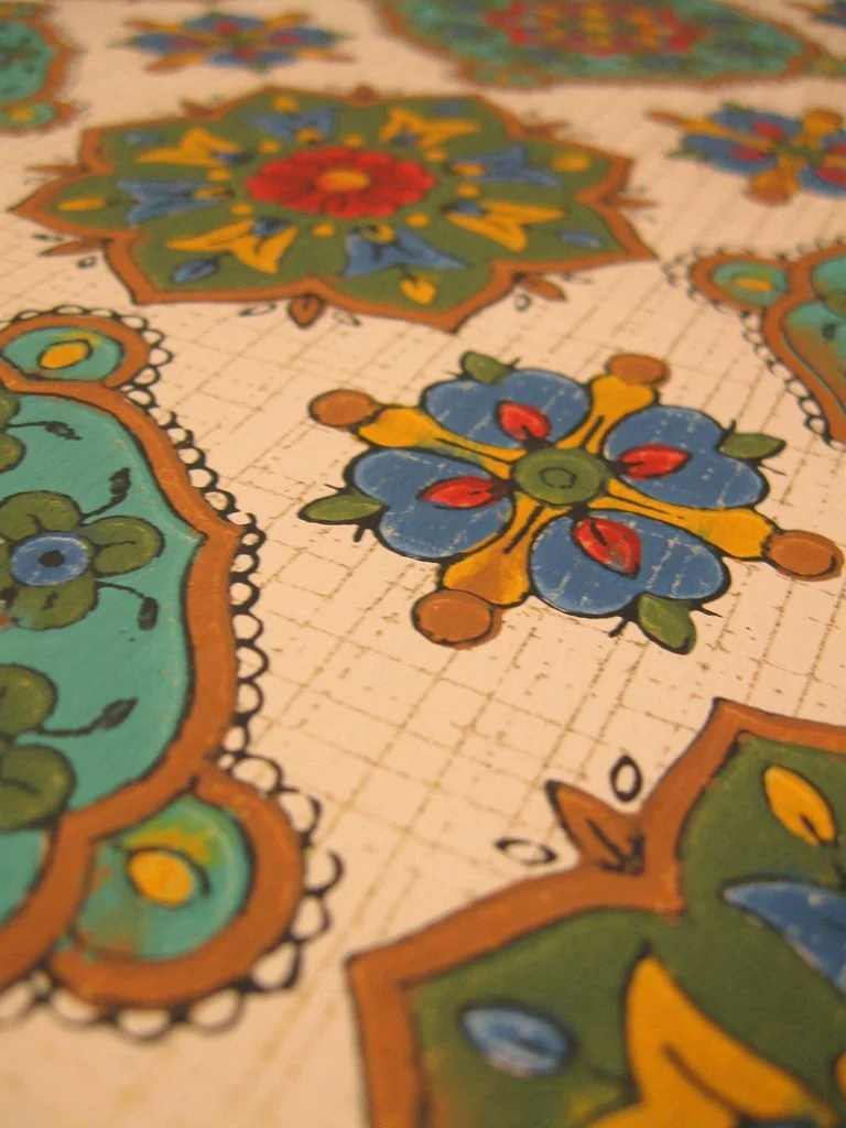 The folkloristic motif, together with the hand-applied colours, creates a feeling of homeliness.