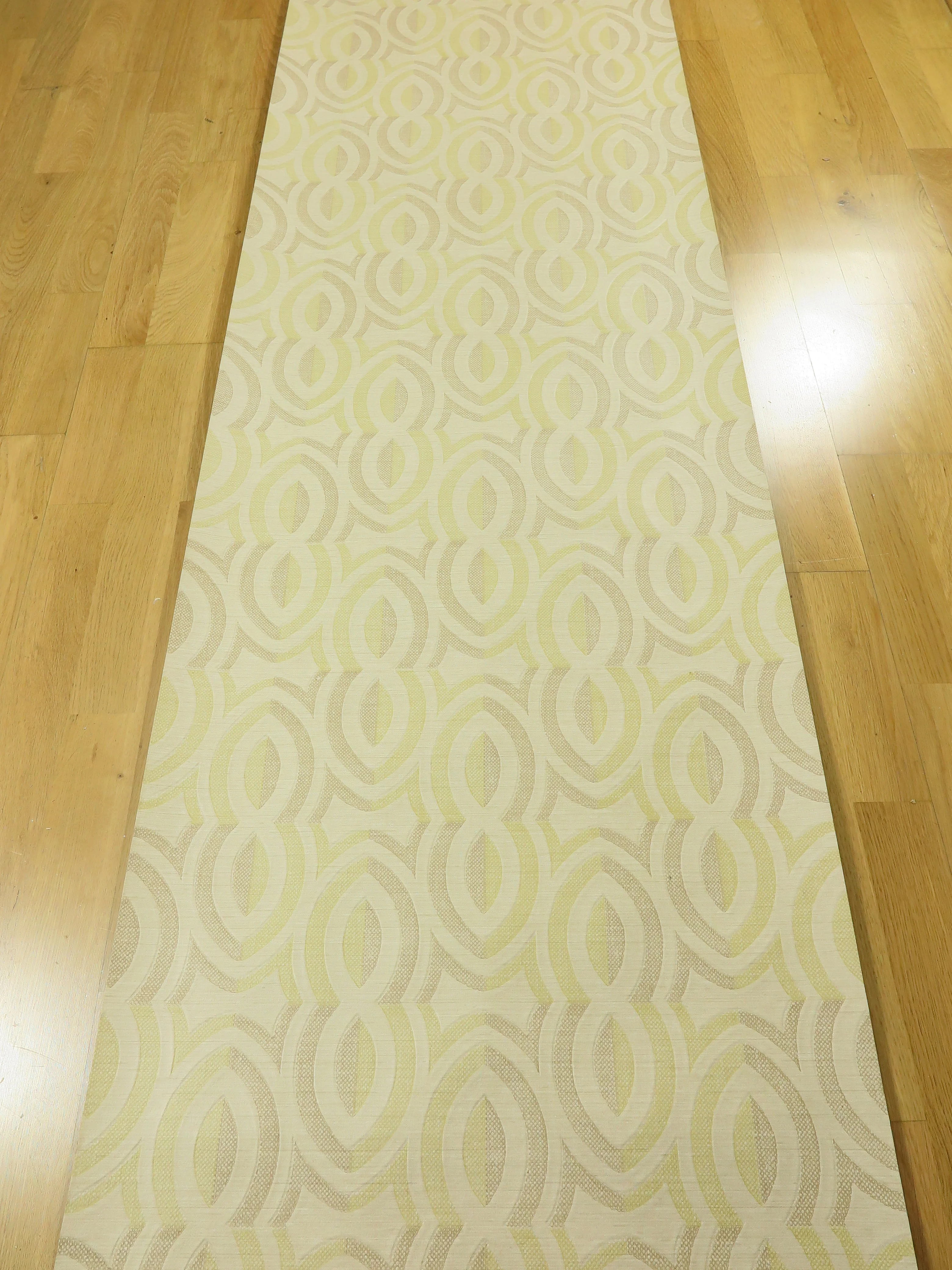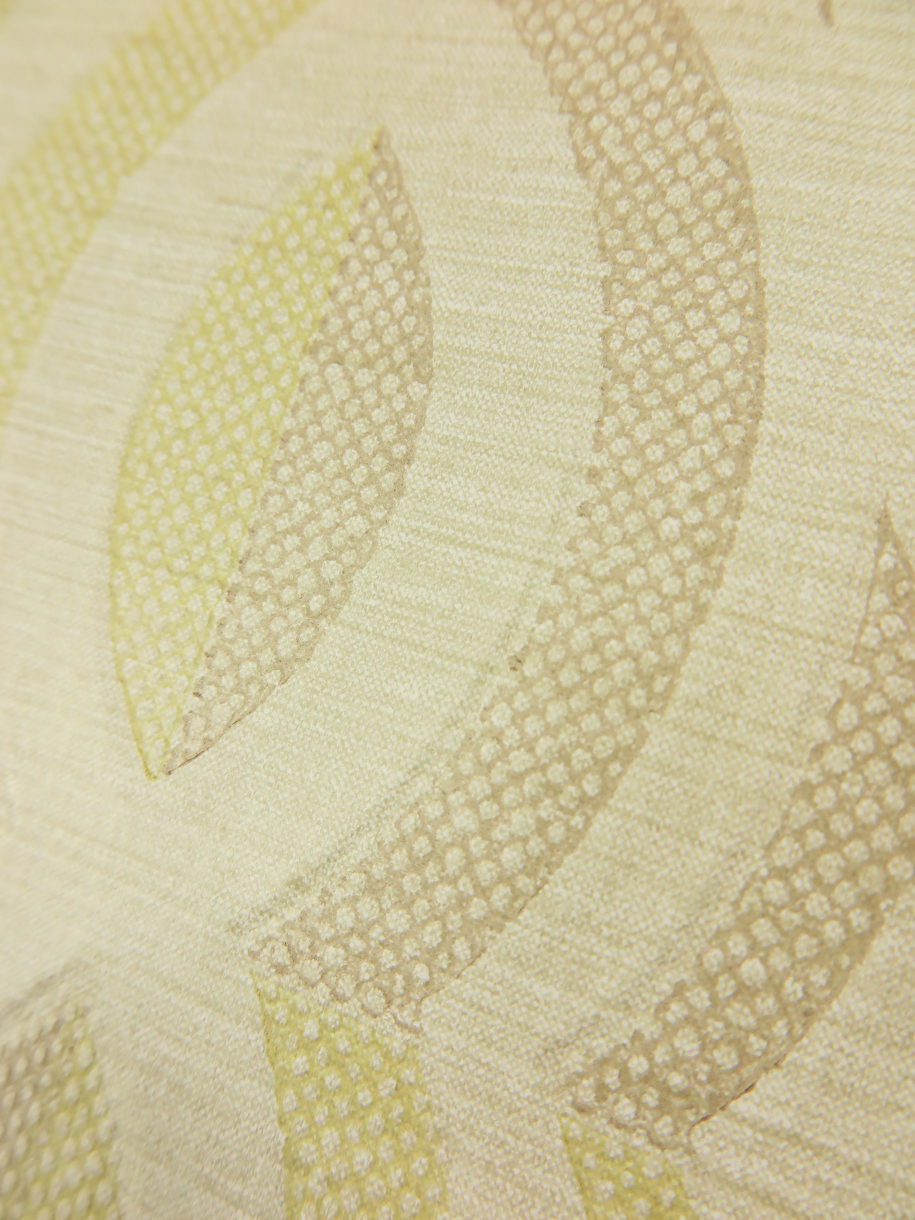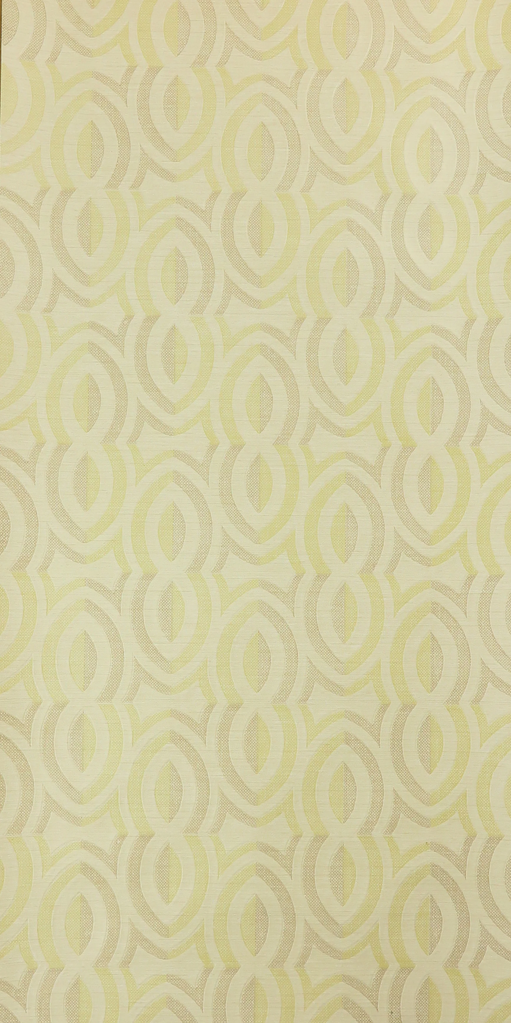The paper wallpaper is embossed in the background like finely woven linen. It is not glossy and shows an elypse pattern.
