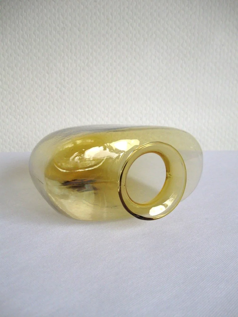 The vase is made of thin, yellow tinted glass