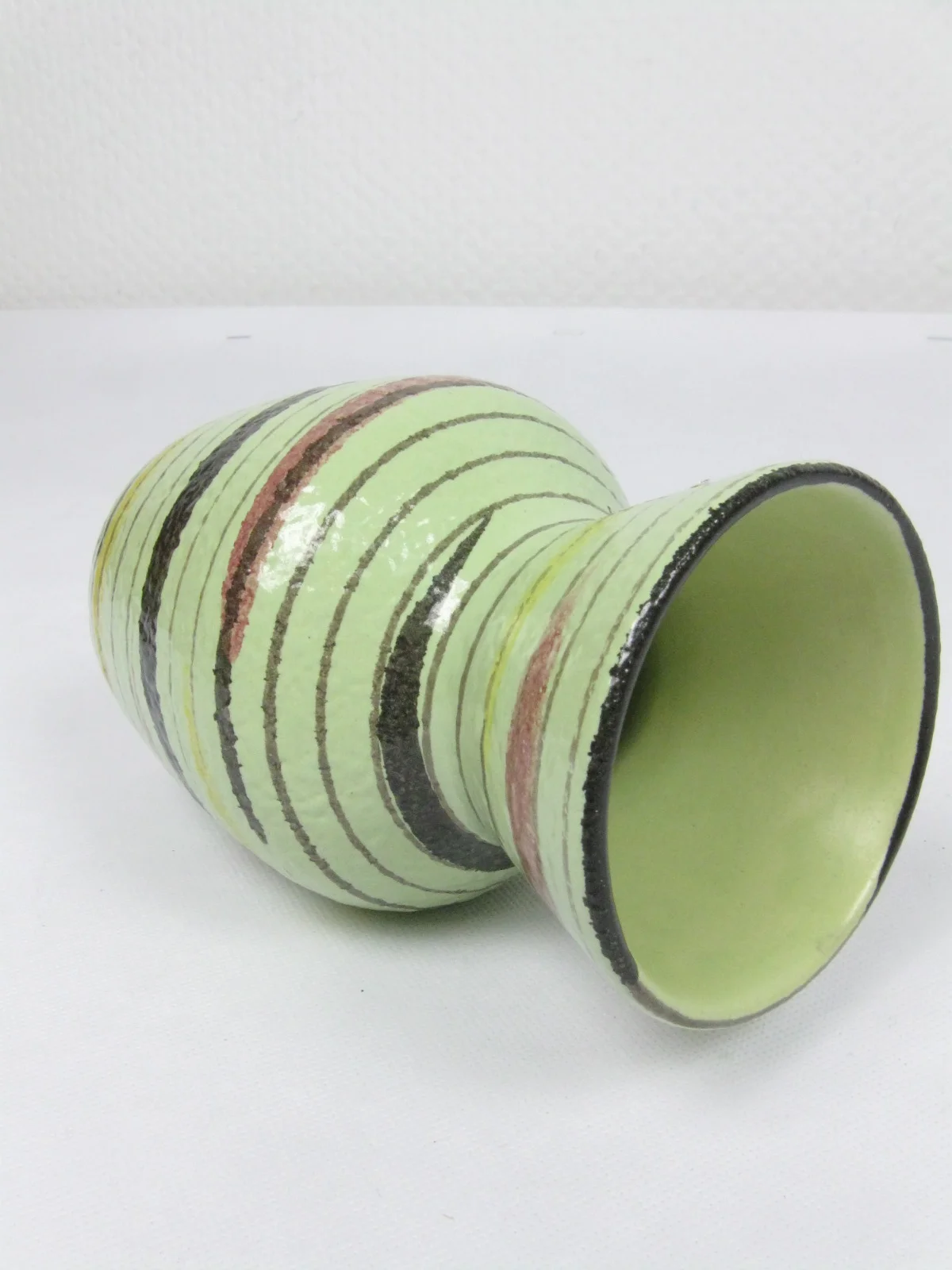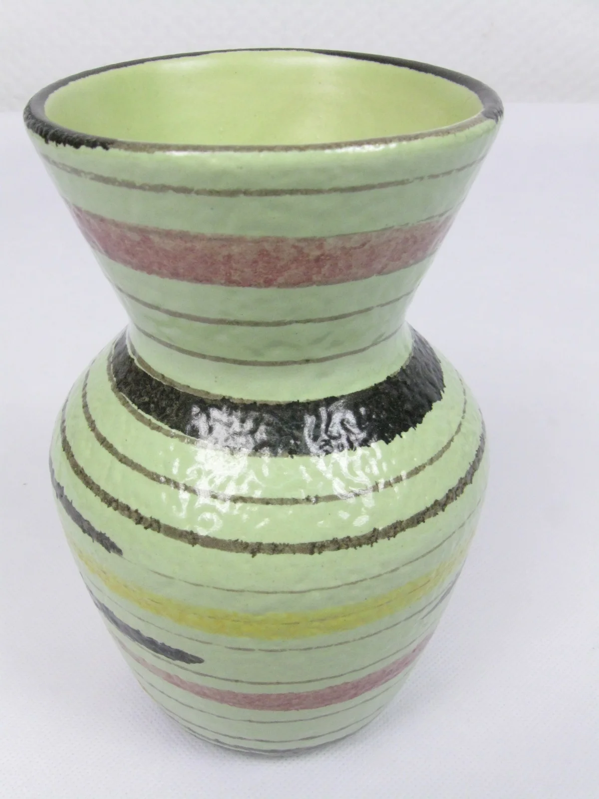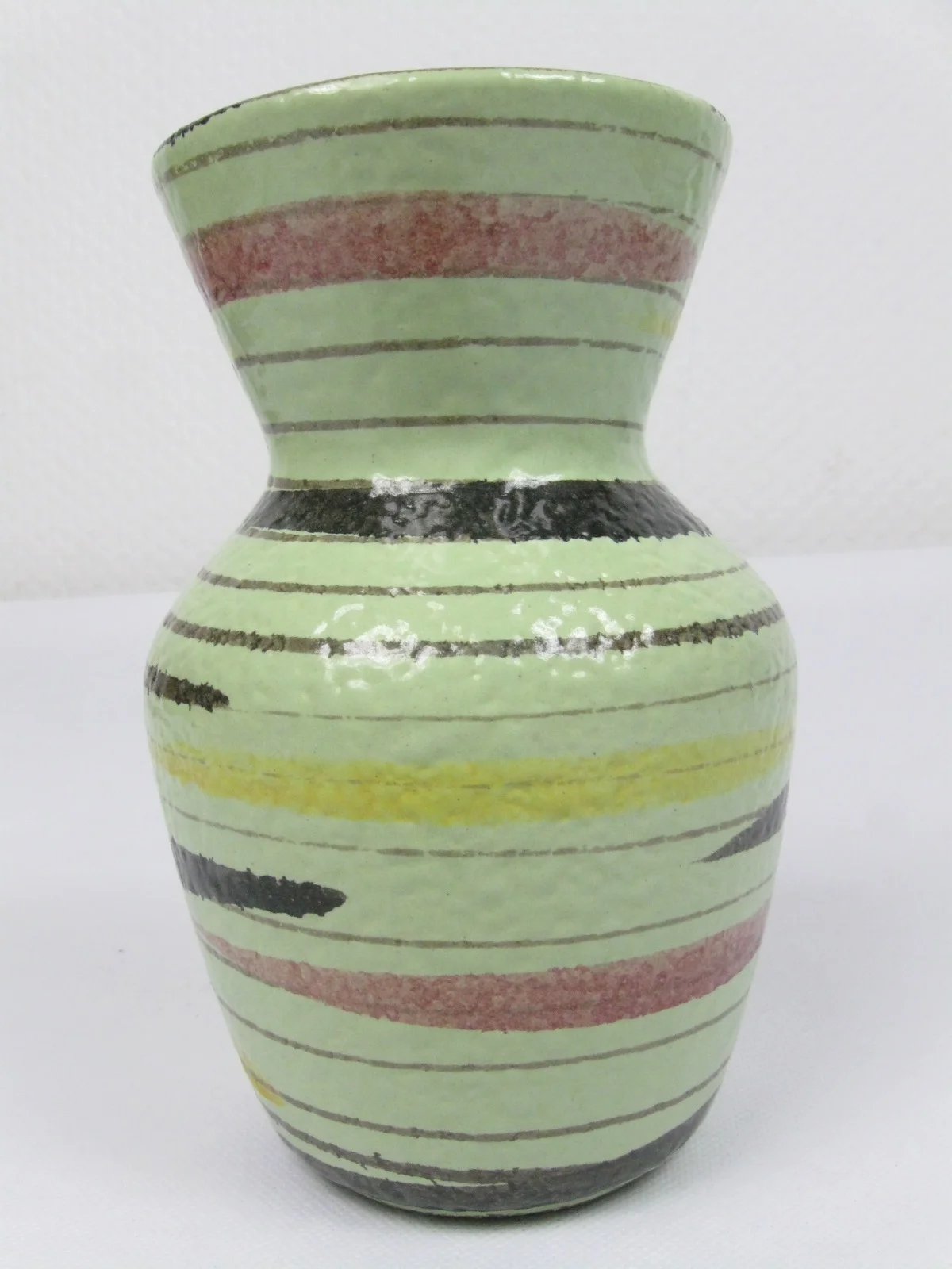 The small vase is made of shiny glazed ceramic and decorated with fine and wide lines in yellow, old rose and brown
