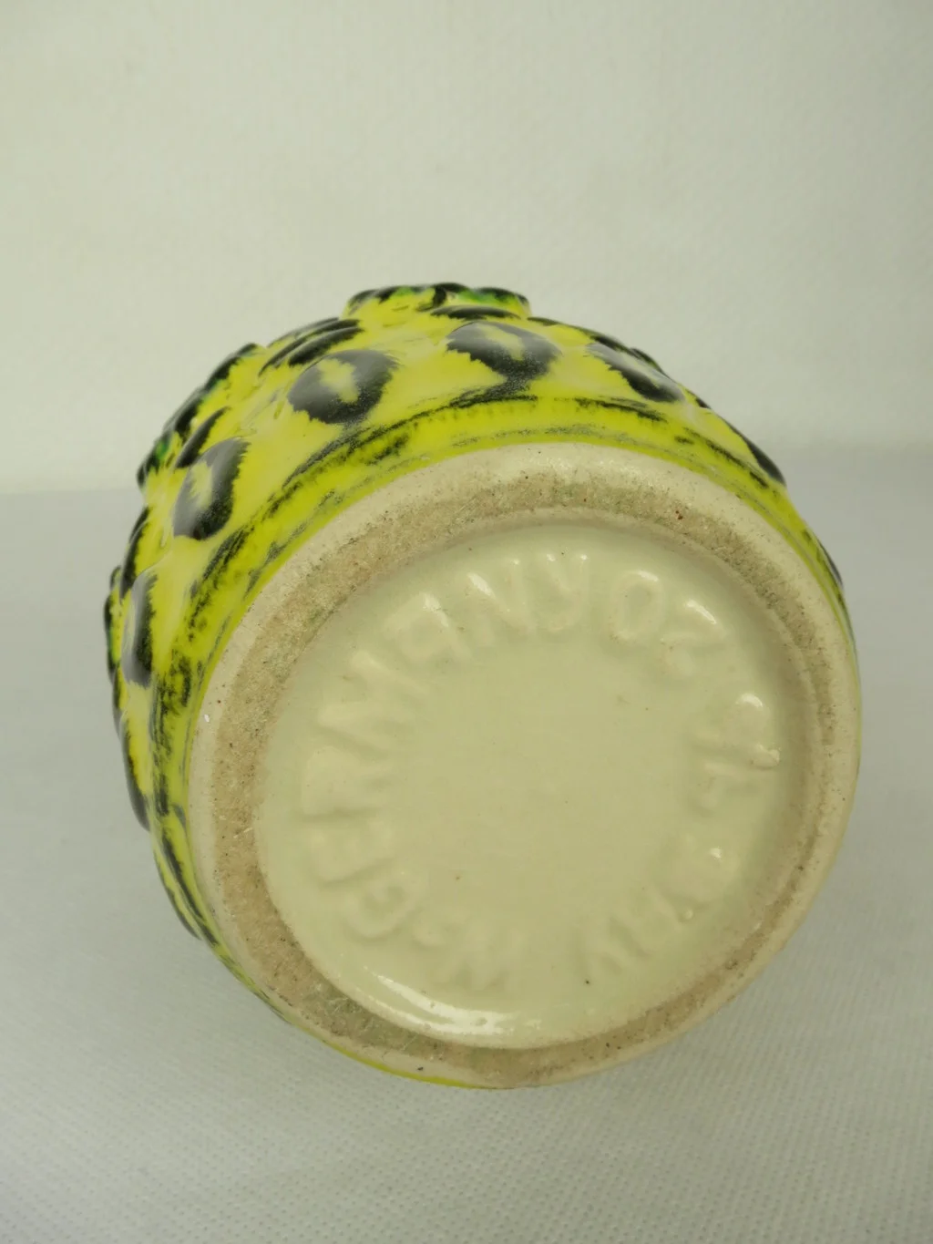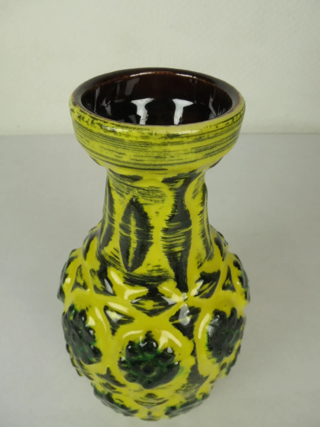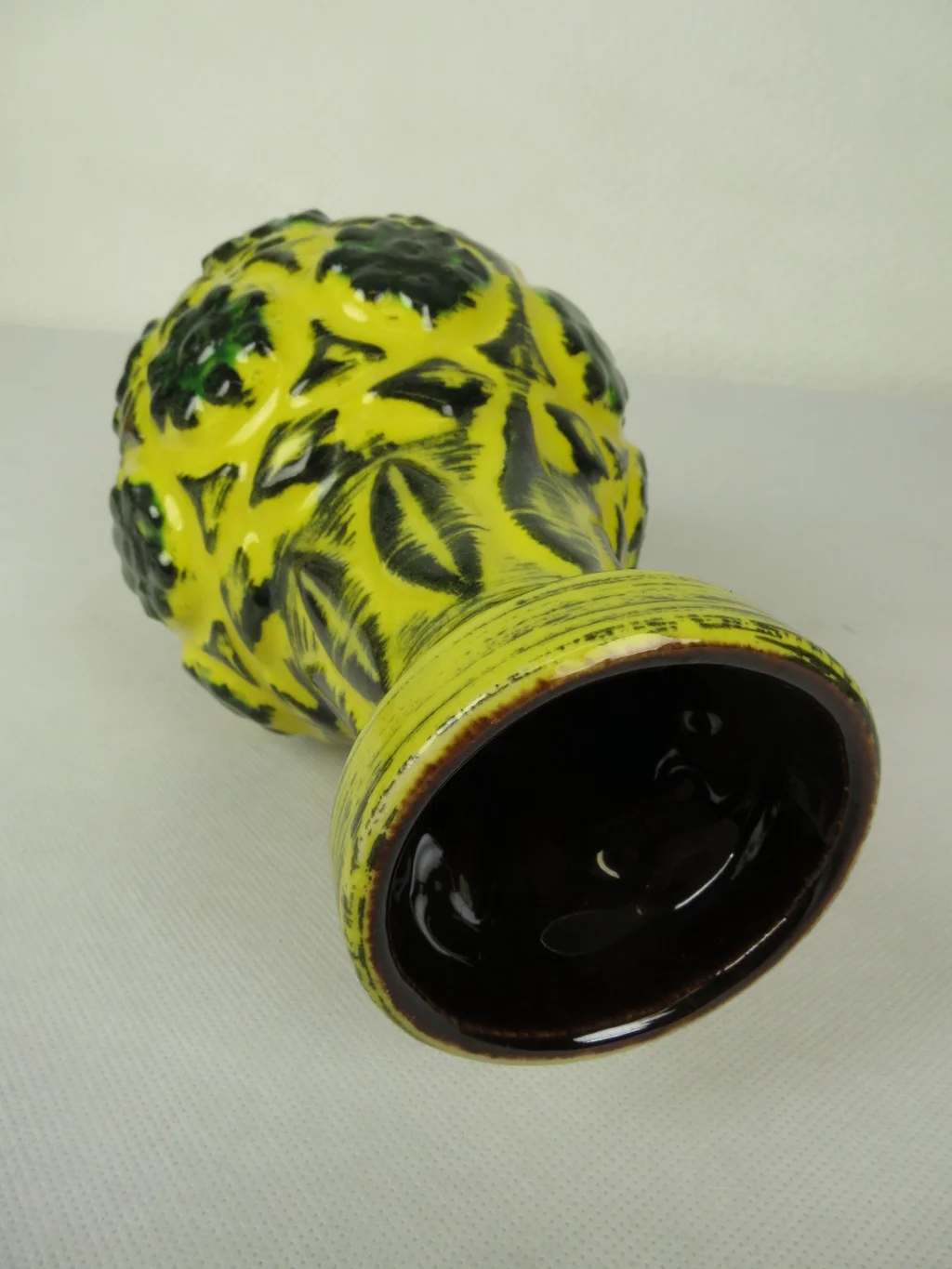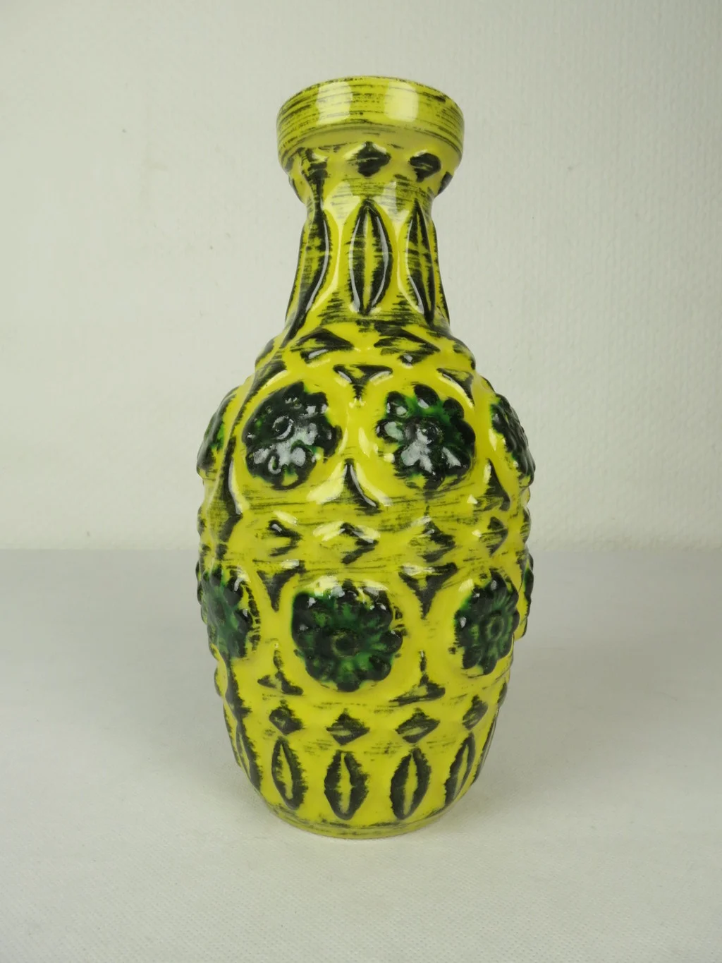 This vase is kept in yellow and green and decorated with small ornaments and flowers.