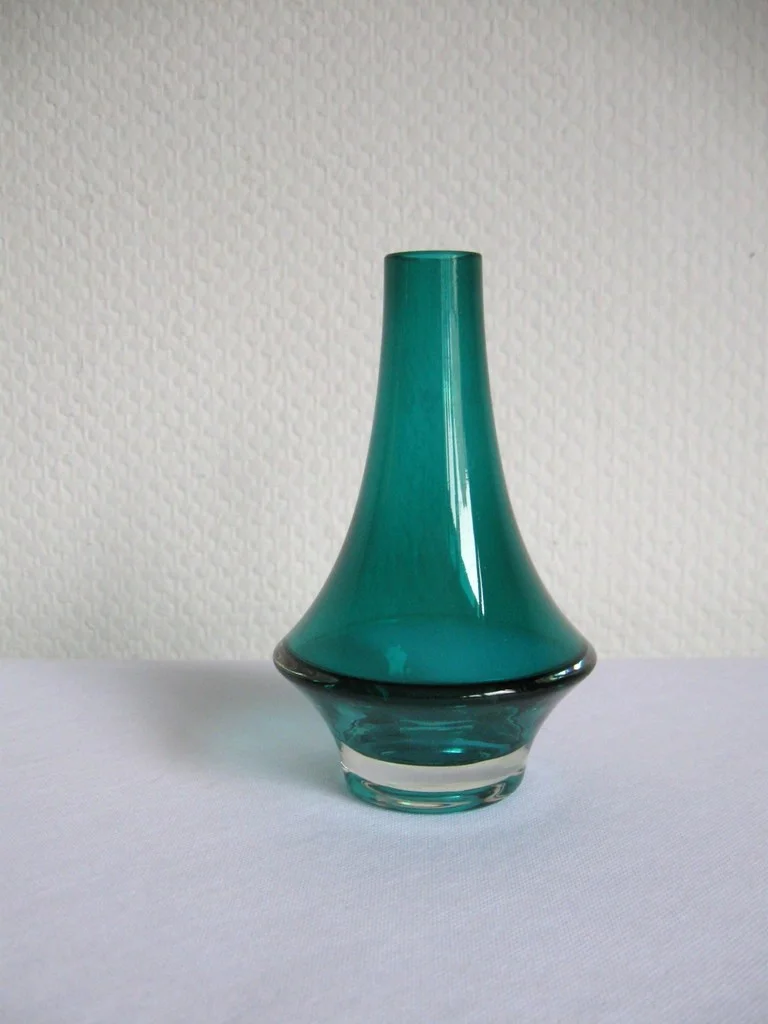 The vase is made of green-blue glass and signed on the underside.