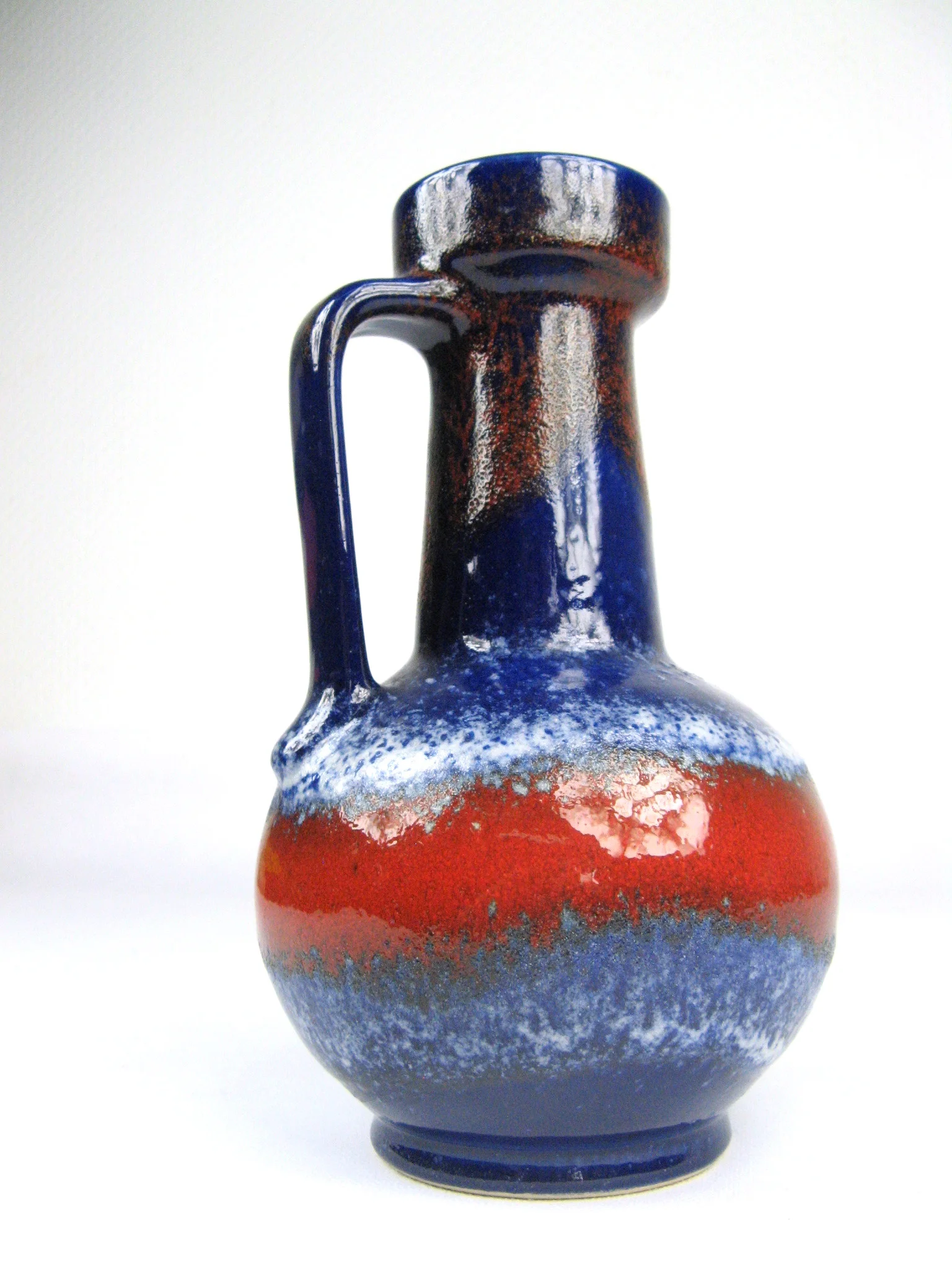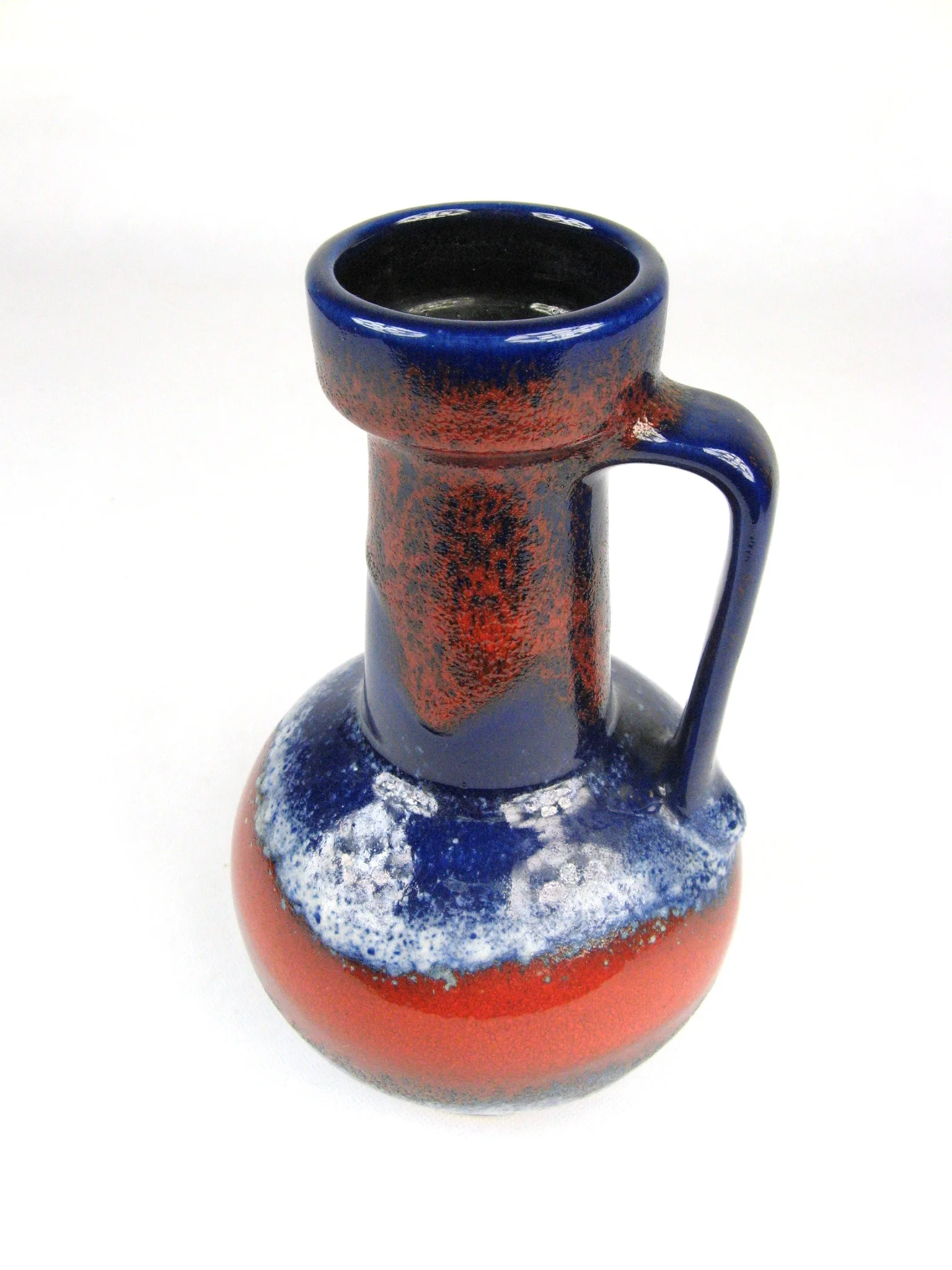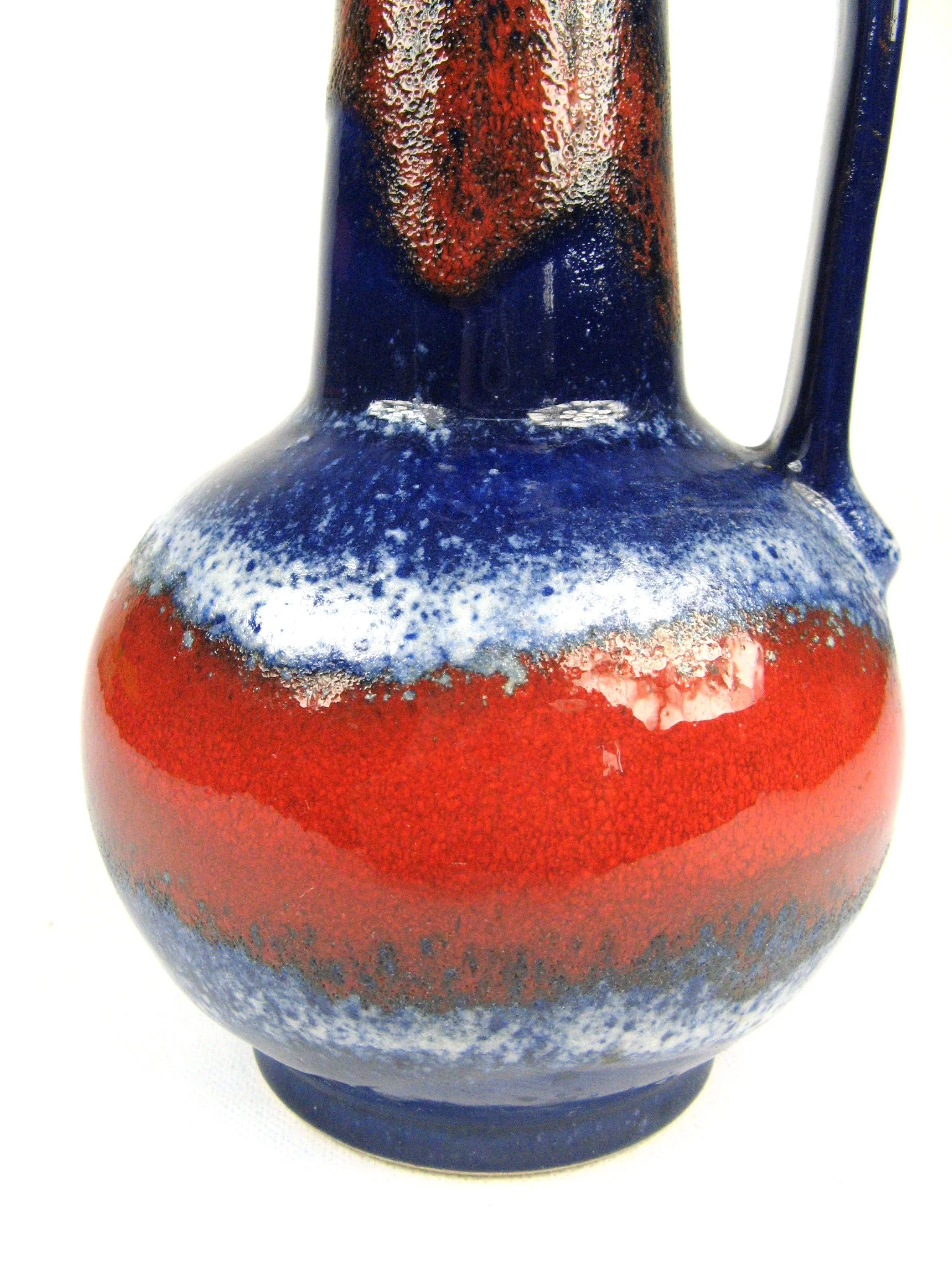 The red, white and blue glaze is tastefully designed in alternating horizontal stripes. Inside the vase is dark brown glazed.