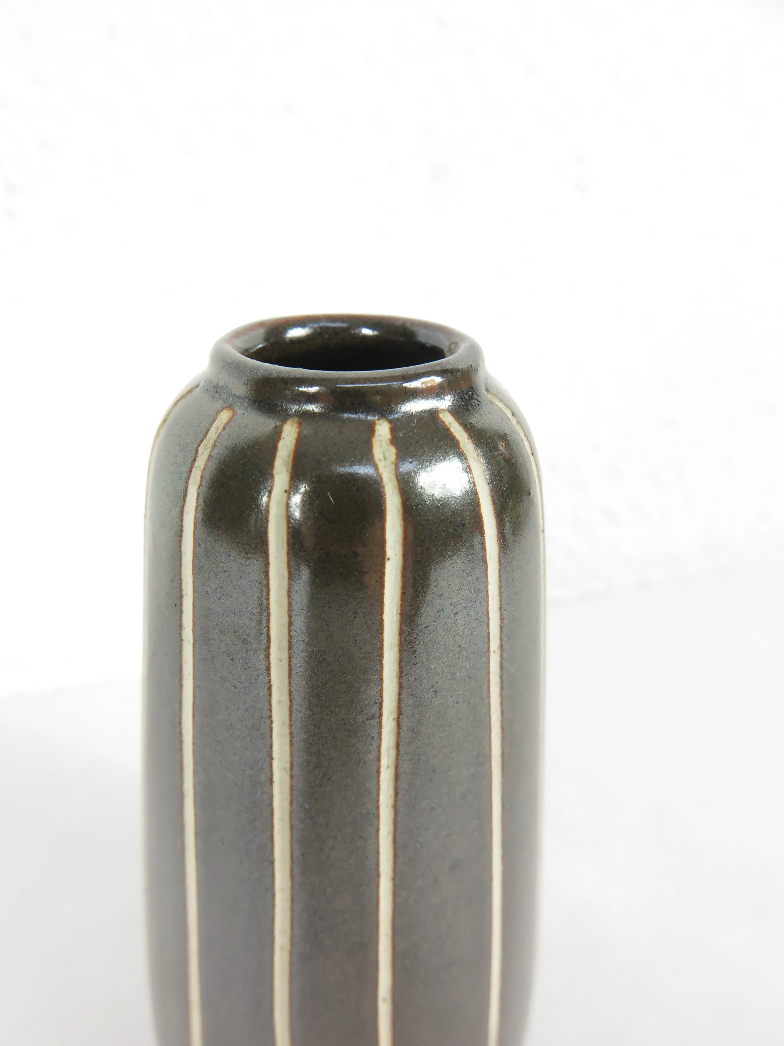 El motivo de rayas del jarrón está grabado a mano.