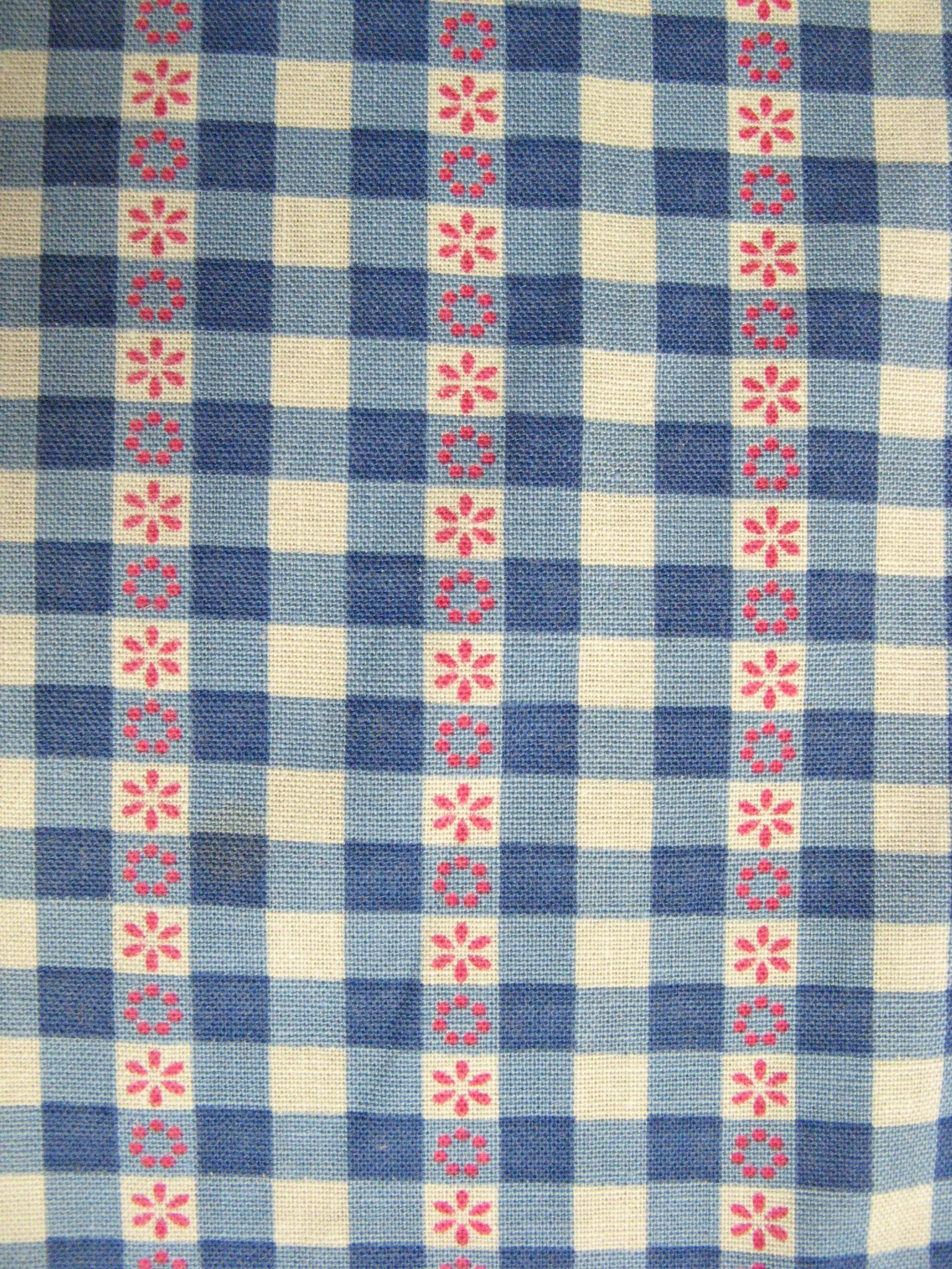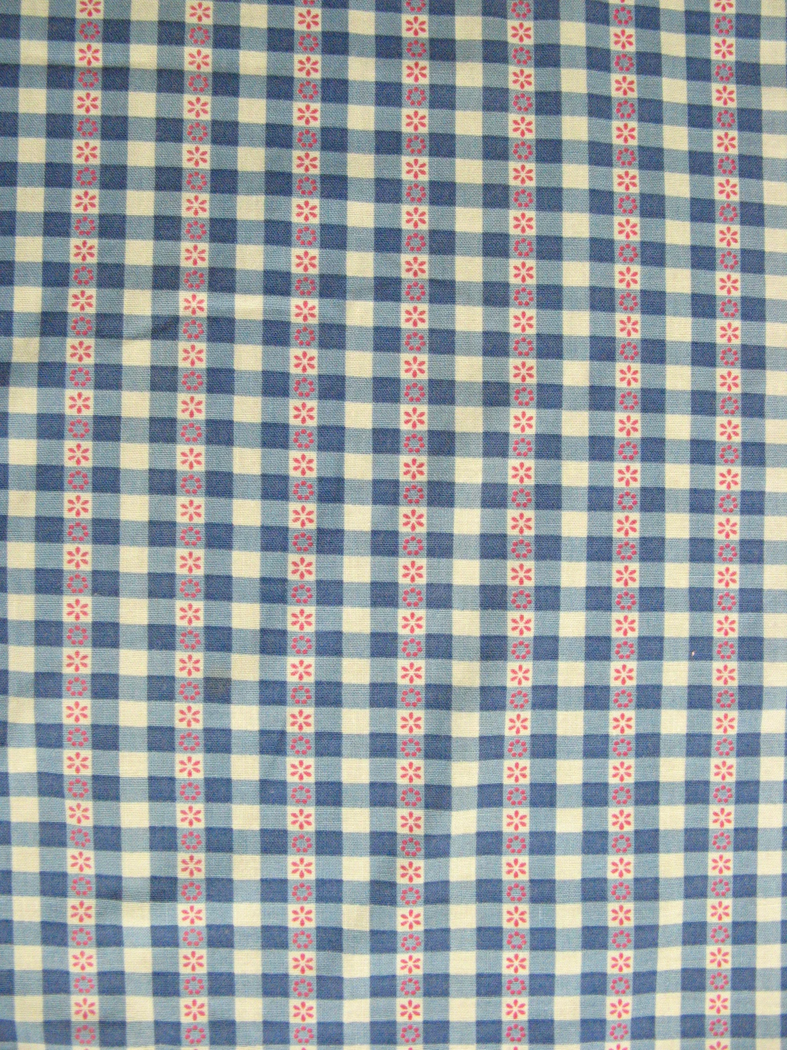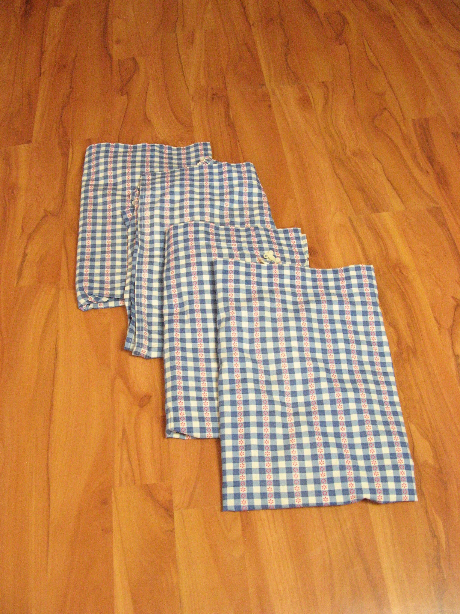 Jolis rideaux originaux des années 70 avec de petites fleurs rouges sur un motif à carreaux bleu/blanc