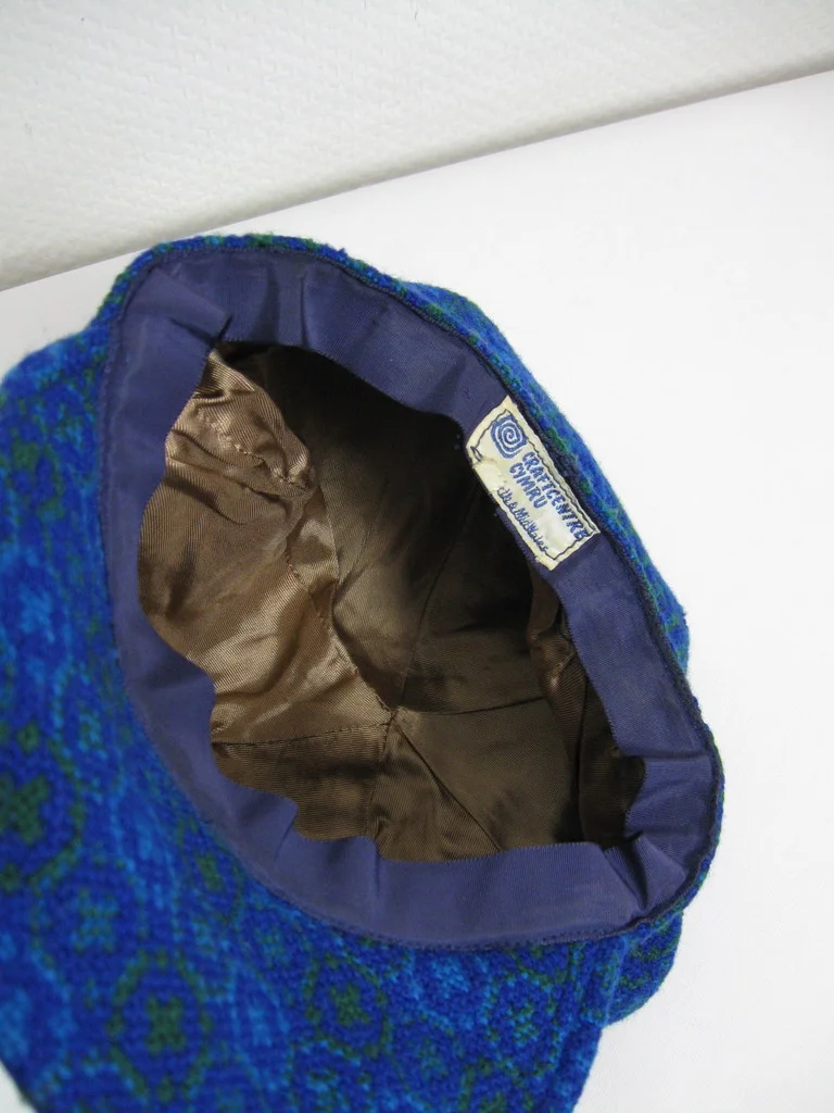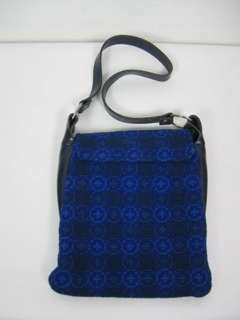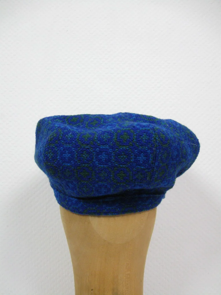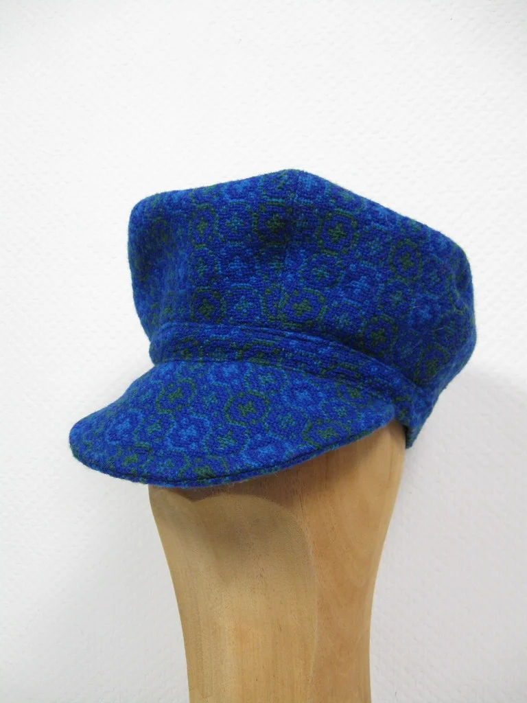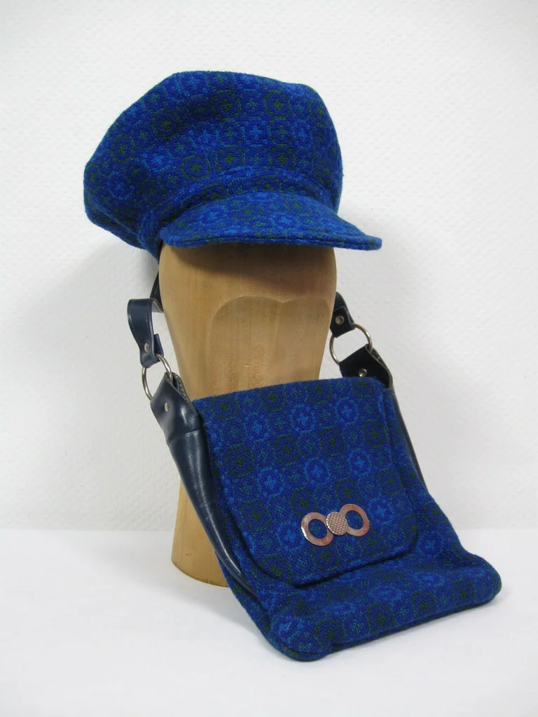 キャップとバッグは合成繊維製。バッグにはサイドエレメントとレザーのショルダーストラップが付いている。バッグには大きなコンパートメントと小さなコンパートメントがある。前面に金属のアップリケがある。キャップとバッグはウェールズ製のハンドメイド。