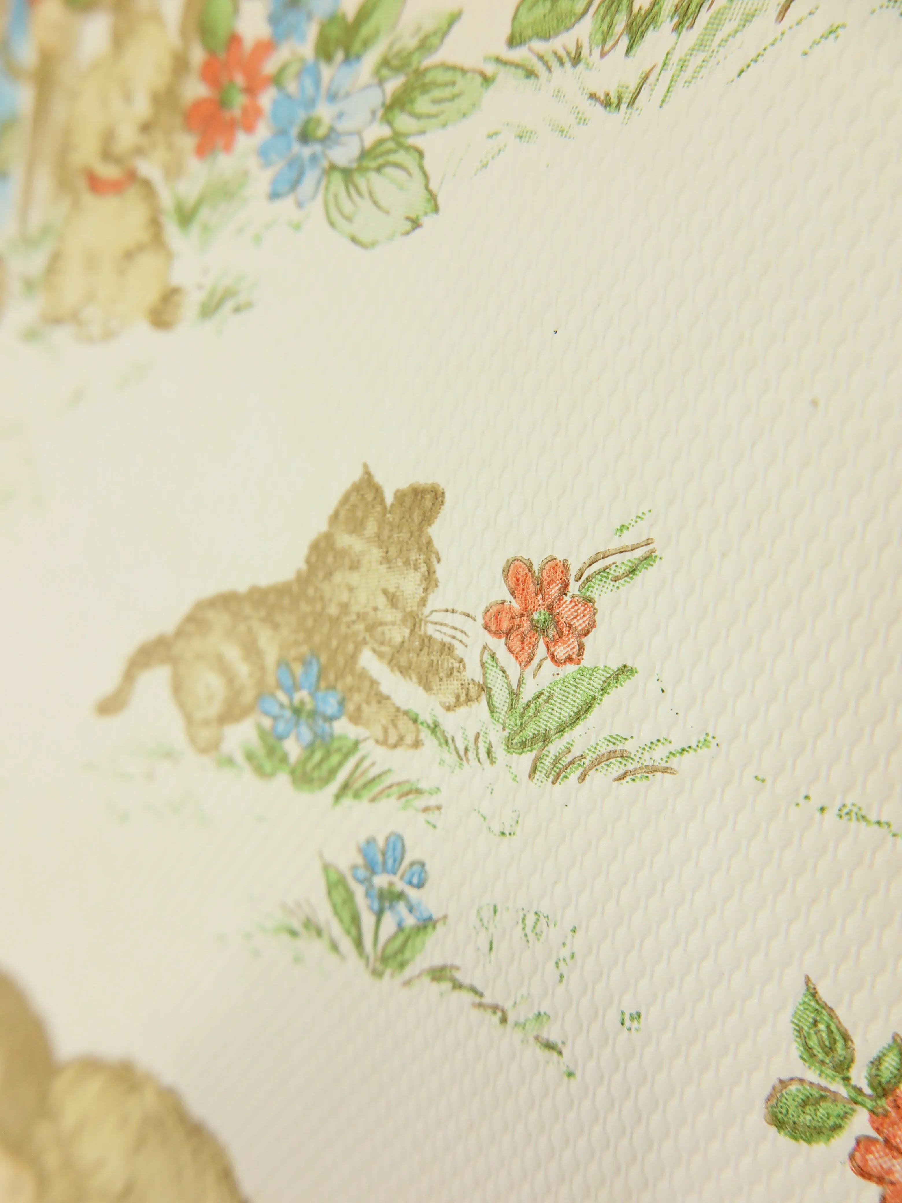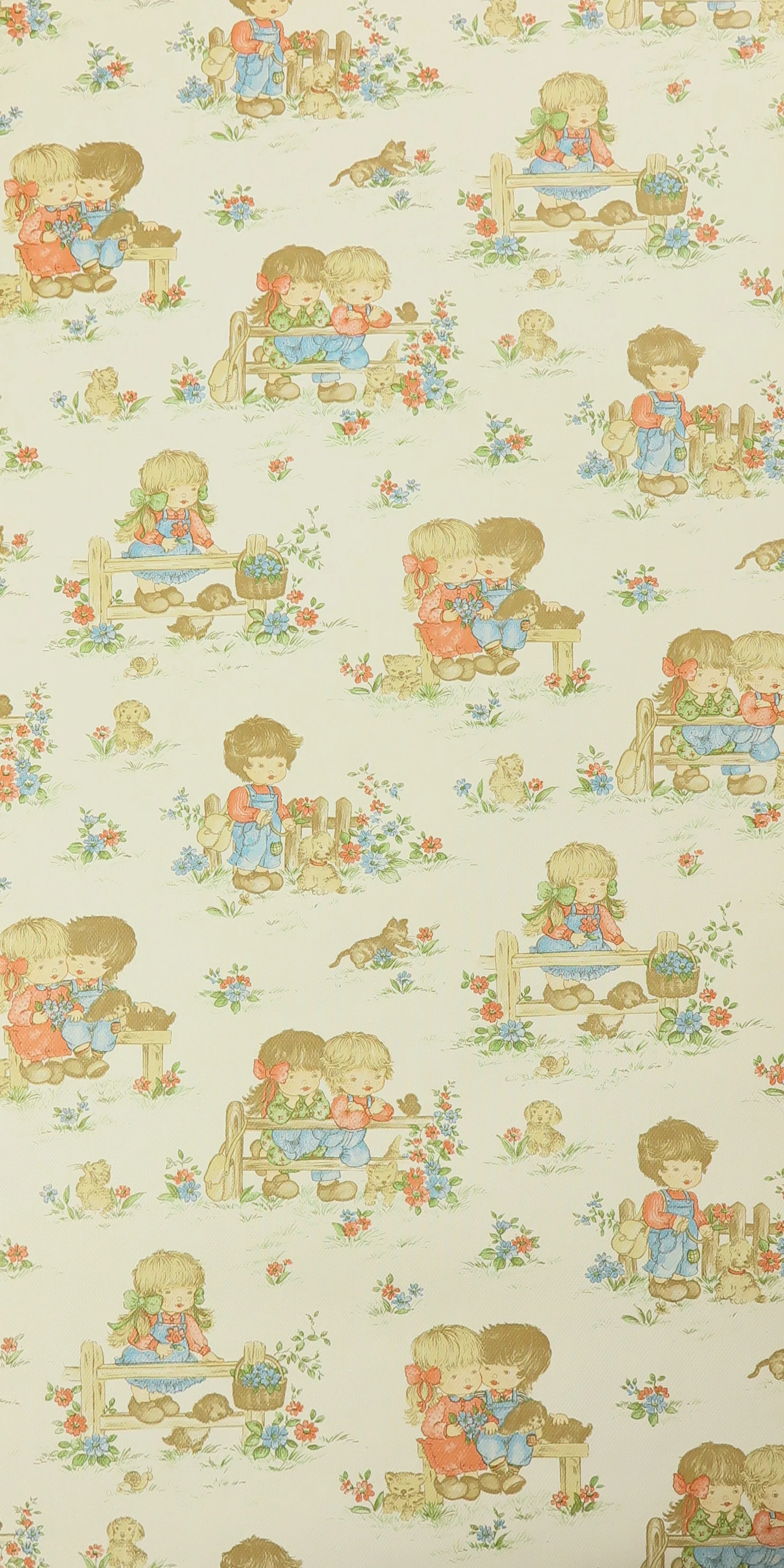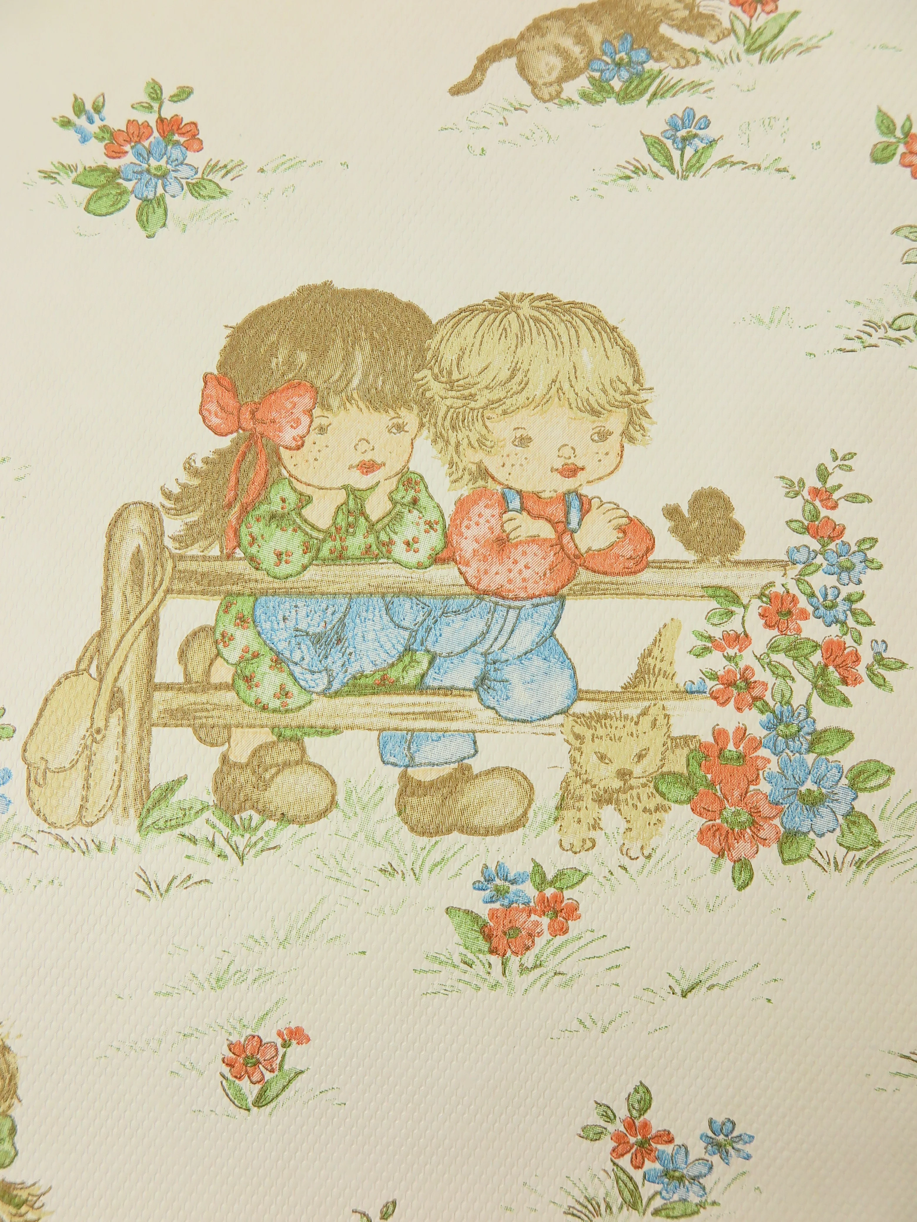 赤、青、緑、茶色とクリーム色の70年代の子供部屋の壁紙